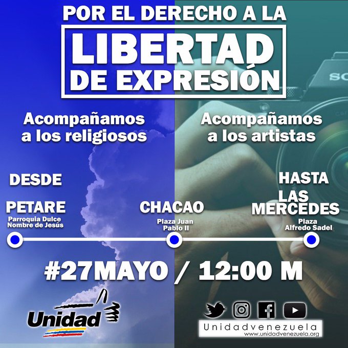 El gremio político aseguró que acompañará a los religiosos desde Petare, parroquia Dulce Nombre de Jesús, hasta el municipio Chacao, y de allí partirán con los artistas hasta la plaza Alfredo Sadel.
