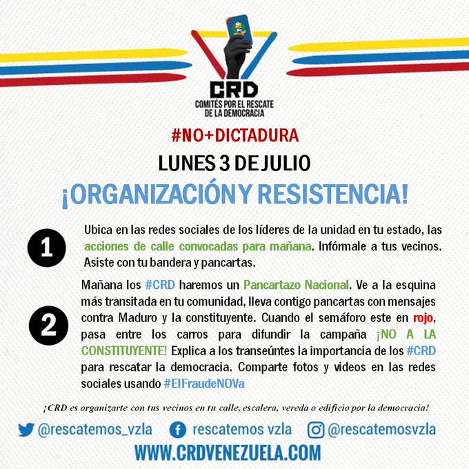 La Mesa de la Unidad Democrática (MUD), a través de sus Comités para el Rescate de la Democracia (CRD), convocó a realizar un “pancartazo” en todas las comunidades del país este lunes.