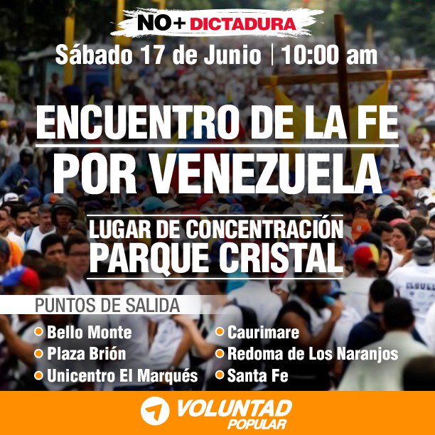 La Mesa de la Unidad Democrática marchará hasta la avenida Francisco de Miranda, específicamente a Parque Cristal, a la que denominó "Encuentro de Unidos en la Fe por Venezuela".